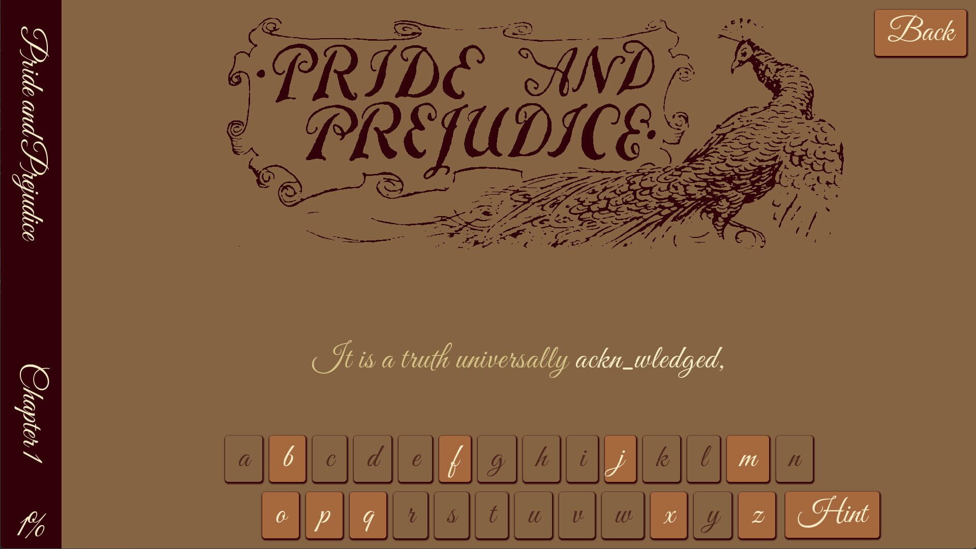 Improve your word-guessing skills with this unique twist on Hangman! Guess sentences from Jane Austen’s Pride and Prejudice. Unlock audio clips and images with no way to lose! Immerse yourself in the greatest love story ever written. Who is “a single man of large fortune”? D_r_y